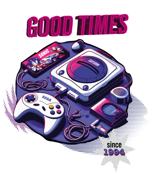 T-shirt preta com ilustração "Sega Saturn" de algodão 190g, impressão em DTF