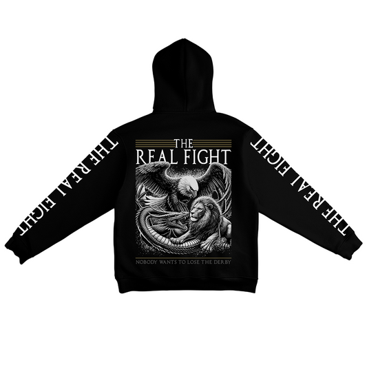 Sweatshirt preta "the real fight", unissexo com capuz - 320 g/m2, 50% algodão, 50% poliéster