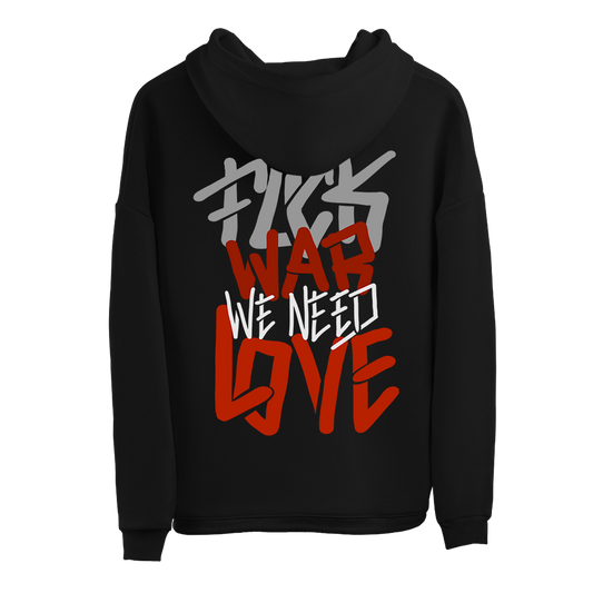 Sweatshirt preta "f*** war, we need love", unissexo com capuz - 320 g/m2, 50% algodão, 50% poliéster