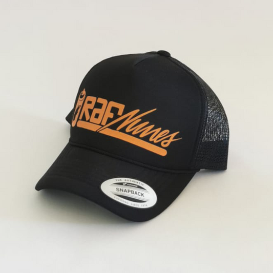 Trucker cap, mesh cap, black and orange "RAFNUNES"