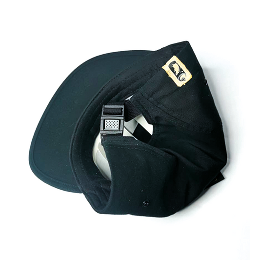 Snapback cap with back adjustment, black and gold embroidery
